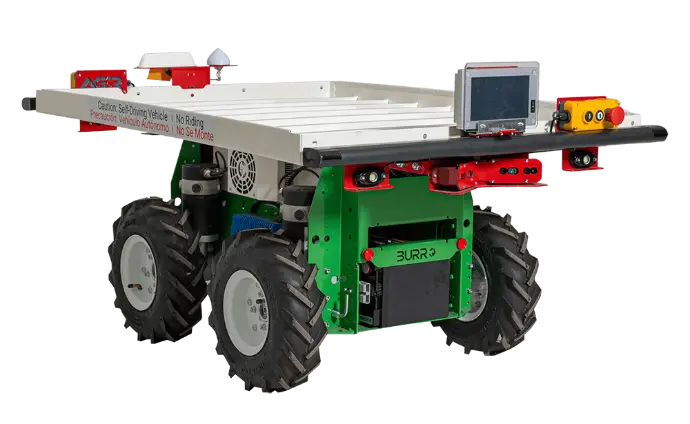 BURRO was forged in the fields, running side-by-side with our customers since 2017. BURRO, in its standard configuration, is primarily a carrying vehicle, designed for use in the harvesting of specialty crops. BURRO utilizes computer vision, high-precision GPS, and AI to navigate autonomously in outdoor environments. BURRO has also proven to be a formidable mobility platform for complementary systems to ride on, such as spraying, mowing, monitoring, and more.